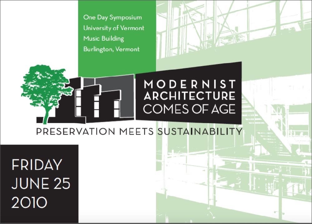 "Modernist Architecture Comes of Age: Preservation Meets Sustainability" symposium poster, 2010. Source: UVM Historic Preservation Program Resource Library Notes1. “Dedication/ Baird Building/ Given Medical Building/ March Life Sciences Building.” The University of Vermont. October 1968. 2. “The Courtyard at Given.” The Courtyard at Given | Planning, Design and Construction | The University of Vermont, July 2009. https://www.uvm.edu/arch/courtyard-given |