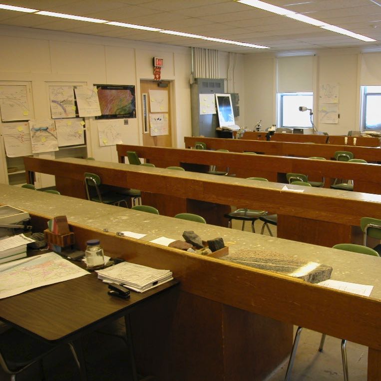 Perkins Hall Geology Department lab, 2003 view. Photo by Thomas Visser Two years later the UVM Perkins Geology Museum and the UVM Geology Department were moved to Delehanty Hall on UVM's Trinity Campus. Since the museum’s move, Perkins Hall has undergone renovations, one in 2017 for lab and classroom space, and one in 2019. During the 2019 renovation, the Champlain Thrust Fault oil painting was discovered behind a false wall- originally there to protect it. During the 1992 renovation, a false wall was constructed to protect and preserve it.15 While Perkins Hall no longer houses the prestigious geology collection, there are still stories being told, both old and new that are associated with the history of the UVM Perkins Geology Museum and the UVM Geology Department, which in 2021 was proposed to be merged with the UVM Geography Department.