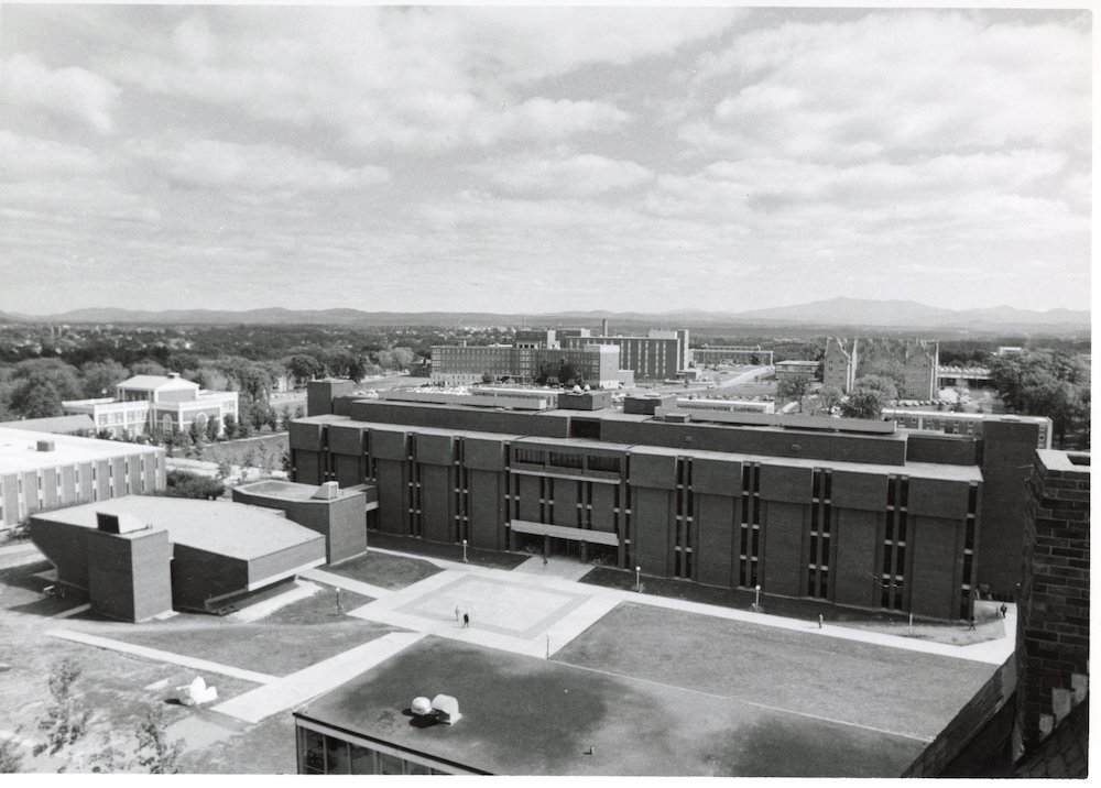 Living & Learning Center (1972)By Brooke TalbottLocated at 34 University Heights, the Living Learning Center of today looks very similar to when it was first constructed. In January 1972, the University of Vermont signed a contract with officers of the Carlson Corporation of Cochituate, Massachusetts and architect George Yurchison of Rochester, New York for the construction of a Living and Learning Center for the university.1 The Carlson-Yurchison proposal called for a six-structure community, made up of five residential clusters centered around a learning and recreation center. Construction was planned to begin in the spring of 1972 with a completion date of August 1973. The project was approved by Burlington’s city planners with the condition that “pedestrian movement separation” would be improved across Main Street.2 The planners recommended building plazas over or under the street to allow pedestrians to continue to cross at a different level from car traffic. The center was to be built on Main Street between University Heights and the Marsh-Tupper-Austin dorm; the location was previously occupied by WJOY Radio. The location chosen for the Living Learning Center was partly due to the university’s “sprawl.”3 At this time, city commissioners pushed UVM to develop structures between Colchester Avenue and Williston Road in order to minimize the spread of buildings which occurred in the past. UVM was also discouraged from building up instead of out; before this point, high-rise proposals had been rejected by the city.4