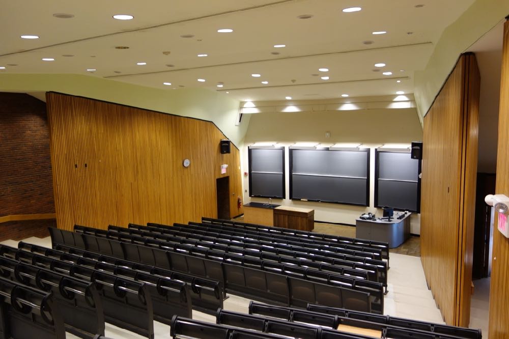 Stairwell in Cook Physical Sciences Building, 2015. Photo by Thomas Visser. Of particular note in the new Cook Science building was the Academic Computing Center, which appears to have been an effort to align with the cutting-edge technology of the day. An article in the January 5, 1972, edition of the Burlington Free Press goes into detail about the development of the new center, noting that as “more and more of our young persons have become familiar with the use of a computer as a tool,” there was a resultant need to have the equipment and expertise to meet the demands of this expanding field of study at UVM.8 Angell Auditorium, 1999. Photo by Thomas Visser