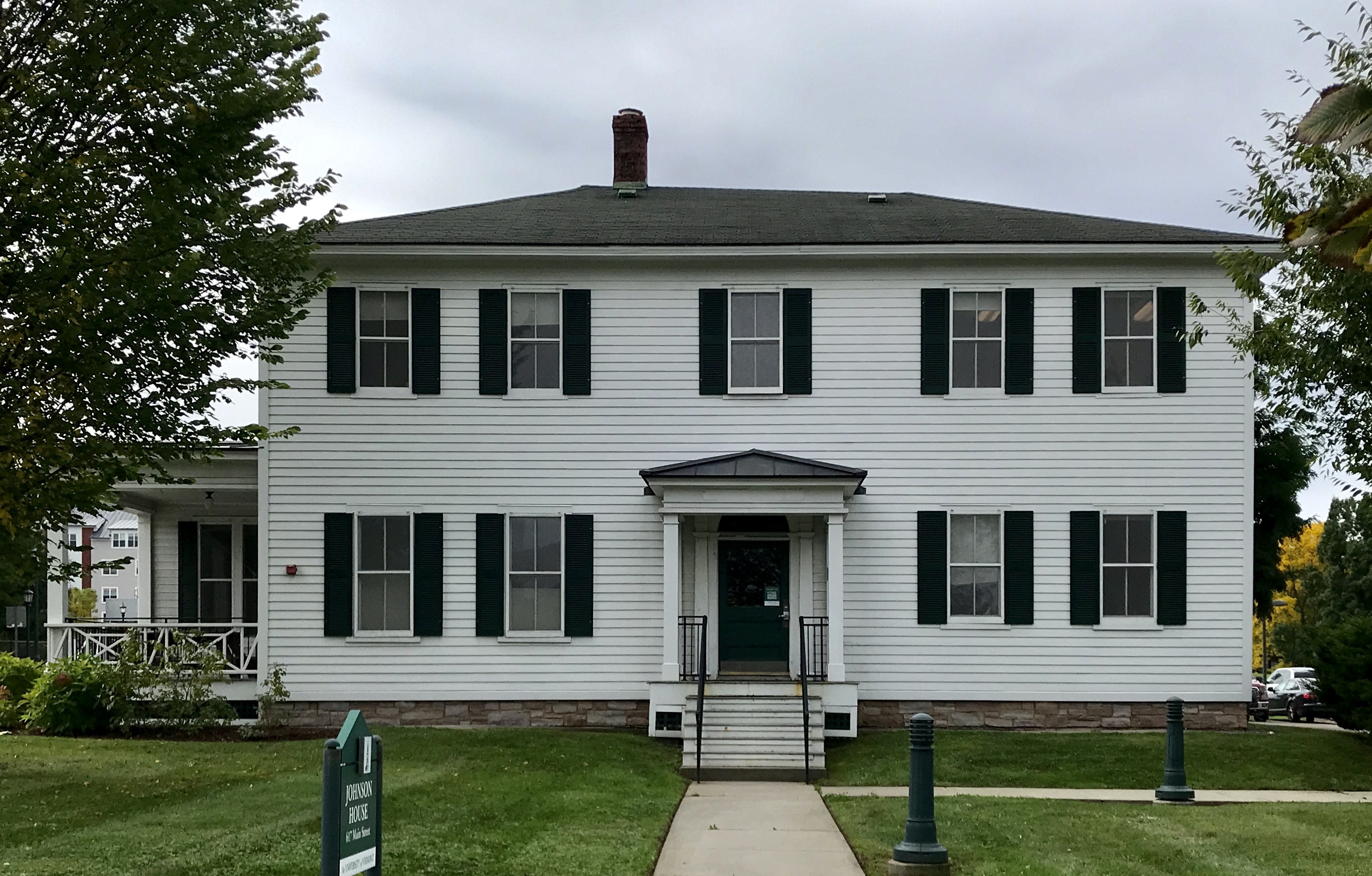 Catlin sold the house to John Johnson, Vermont's first surveyor, in 1809. Johnson was an accomplished and prolific designer and engineer who oversaw the construction of numerous important buildings and bridges in the northern Vermont area, including Grasse Mount (1804) and Old Mill (1824-9) in Burlington. The 1830 Ammi B. Young map of Burlington shows the house as an L-shaped structure with outbuildings attached to the southeast corner and just to the east. These features are shown in more detail on an 1843 map by Edwin Johnson. An image from UVM Special Collections shows the building as it appeared around 1880 at its original location facing the UVM Green. In 1902, J.J. Allen, a direct descendant of Johnson, sold the family homestead to the University, and Johnson House became a part of the Agricultural College. In 1906, in order to make room for the new Morrill Hall, the building was moved up the street (then called Williston Turnpike) to its second location at 590 Main Street.4