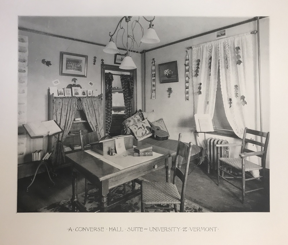 "The Converse Hall." From The Williams and Converse buildings, the University of Vermont (Heliotype Printing Co., circa 1895.) In addition to his contributions to the campus, Converse established a scholarship fund and public debate prize for UVM students.3 Over the decades the building has undergone two major interior renovations, the first carried out by the WPA from 1938-1939, and the second between 1974 and 1975. Although the dorm’s living spaces have changed significantly, extant images, blueprints, and the well-preserved interiors of the former Converse Cottages provide clues to what this early student housing may have looked like. When the building opened to students in 1895, a reporter for the Burlington Free Press described Converse Hall as “A Veritable Palace,” and “one of the handsomest and best furnished college dormitory buildings to be seen on the American continent.” Prior to the 1974 renovation the dorm boasted a gym, a dining hall, and study rooms with fireplaces. The dormitory was intended to foster a sense of community among residents, who would form a number of clubs and sports teams in the early years of the dorm.4