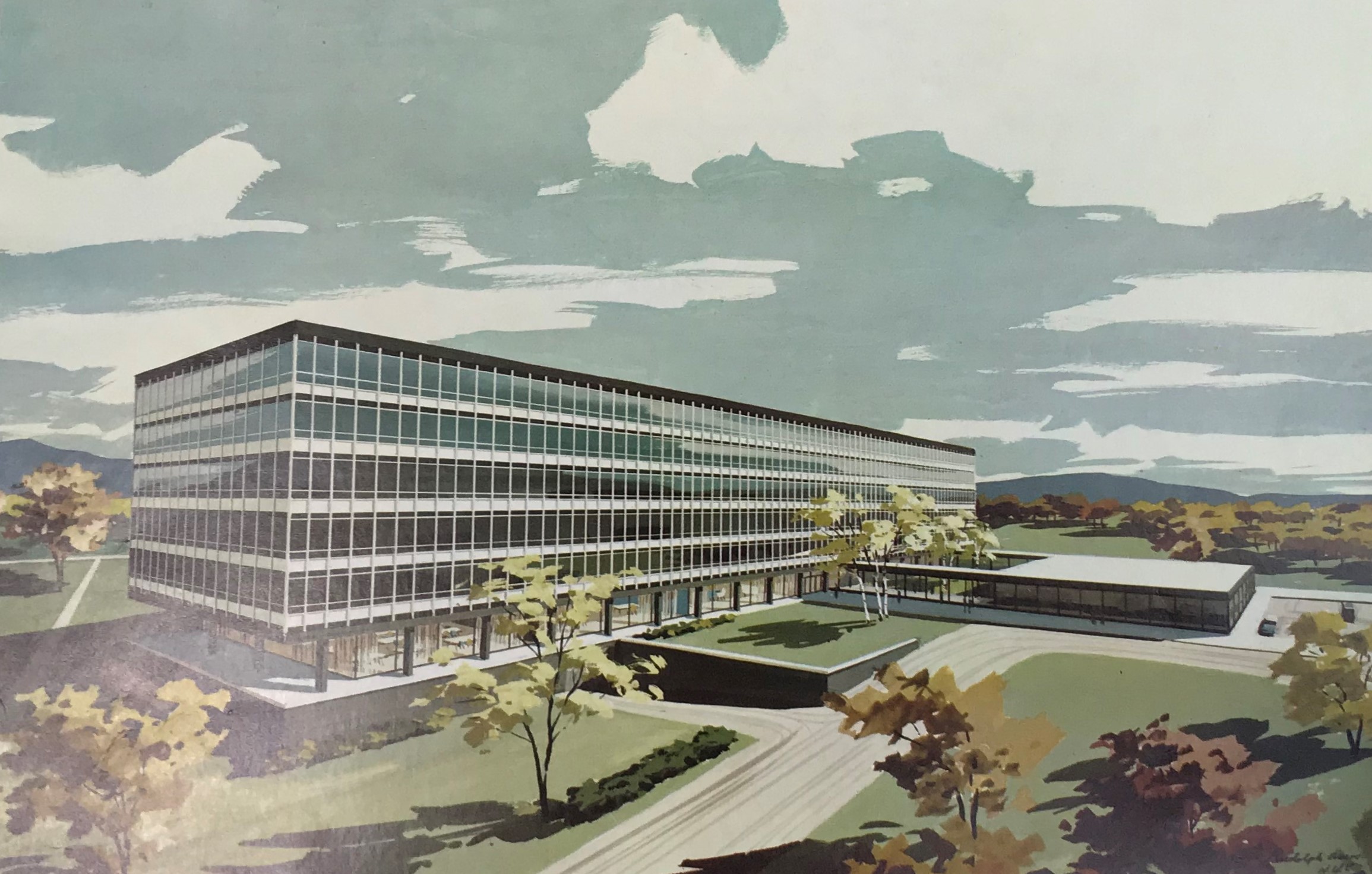 Illustration of proposed Medical Building, "Medical education today for medical care tomorrow / the University of Vermont College of Medicine" October 1956. The new structure included an auditorium and cafeteria, and was intended to serve as the Medical School’s new administrative and research center. With extensive research facilities, electron microscope lab, a major medical library, and proximity to the Fletcher Allen Hospital, the Given Building was intended to serve as a resource to doctors and researchers throughout the region and support the University Hospital.1