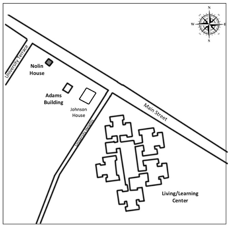 Map of section of UVM Campus showing Nolin House, shaded in top left corner. Map made by Brooke Talbott By 1970, the resident of 589 Main Street changed to Mrs. Madeleine B. Nolin, widow of Bernard F. Nolin.6 Mrs. Nolin was a nurse at Birchwood Nursing Home, a facility which still operates in Burlington today. The structure remained a private residence until 1976, when the University of Vermont purchased it from Mrs. Madeleine Nolin with plans to use it for offices for the Office of Residential Life.7 By 1980, the building was being used as the UVM Instructional Development Center.8 Later it provided offices for the UVM Canadian Studies program. Now known as Nolin House, the building currently houses offices for staff of the UVM College of Arts and Sciences.9