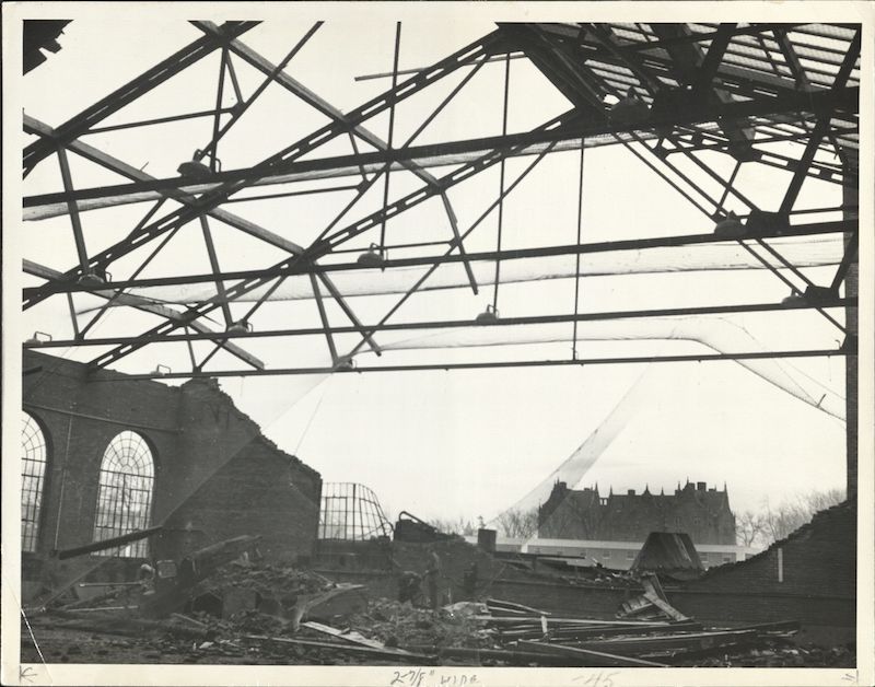 Front, west elevation of Royall Tyler Theatre. Photograph by Brooke Talbott, October 2, 2021. By 1911, however, the gymnasium’s ability to act as a drill hall was no longer feasible. As a result, a glass-roofed structure, known as “The Cage” was erected at the back of the building. Construction for the new structure was begun in May 1911; the structure measured 120 feet by 100 feet, with concrete foundations, a slate roof and steel trusses, rendering the building fireproof. It was lit by a skylight on the south side of the roof, measuring 90 feet by 30 feet, and was steam heated.5 The Cage served as a baseball cage and a drill hall for the University Battalion. Along with these two main functions, the Cage also acted as an assembly and concert hall into the 1940s.6 In November of 1950, the roof of the Cage was completely blown off by a storm. The Cage resembled a “bombed out building,” with damages estimated to be $150,000.7 By June 30, 1951, however, repairs to the building were complete. Repairs were completed entirely by the UVM maintenance department.8
