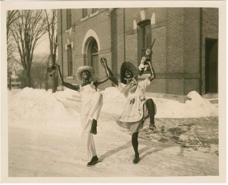 Partial map of UVM campus showing the Royall Tyler Theatre and The Cage. Both structures are shaded. Map made by Brooke Talbott. The origin of the University of Vermont’s Kake Walk dates back to the 1890s. While the origins of UVM’s first Kake Walk are somewhat unclear, it is believed to have begun in 1894 in a men’s residence hall as a “spontaneous bit of horseplay” after a military ball had been canceled. 13 When the Kake Walk first began, it resembled American minstrel shows, a form of entertainment which featured white performers who blackened their faces with burnt cork.14 These performers caricatured African Americans through song, dance, stories, and stand-up comedy. Characters generally featured the “uncultured, parochial, happy-go-lucky southern plantation slave (Jim Crow) in his tattered clothing, or the urban dandy (Zip Coon or Dandy Jim), frequently presented as slow-talking, mischievous and gaudily overdressed.”15 Along with being dim-witted and lazy, both characters were always fond of watermelon and chicken. The “cakewalk” dance, which was a standard act in minstrel theatre, originated on plantations as a competition between slaves.16 The pair of slaves who most entertained white owners would be rewarded with cake. The University of Vermont’s Kake Walk took on a life of its own, however, creating its own traditions and becoming one of UVM’s most anticipated events each year. Early Kake Walks at UVM occurred during the Winter Carnival weekend, which took place over a weekend in February each year.17 Preparations for the event took place year-round; the entire event was directed by three senior men, four junior men, and one female student appointed as secretary. While the “a walkin’ fo’ de kake” competition was the main event of the weekend, the overall event also included stunts, a peerade, and skits.18 In the 1930s and 1940s, the event added the election of the Kake Walk King and Queen. By the 1960s, the three-day festival had evolved to include a ball, jazz concert, winter sporting events, and ice sculpture competitions. Until 1965, the “walkers,” the performers who completed the Kake Walk dance, came from the sixteen campus fraternities.19 Each Kake Walk performance starred pairs of men dressed in costume and wearing blackface; until 1916, one of the men dressed in drag. Each pair competed in a “strenuous display of kicking, strutting, and fancy stepping that gives premium points to the height of the kick and coordination of each pair as a team.”20 The walking was done in colorful costumes, known as “silks,” to the tune of “Cotton Babes.”21 While the event was extremely popular from its inception, by the 1960s its popularity reached a climax as the “cheers of about 8000 students, alumni and residents of the area who jam the University’s Patrick Gymnasium” could be heard.22