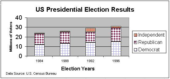 Area and 3-D Area: Area graphs are a variation on the basic line graph in which the lines are stacked and the areas between the lines are filled with different colors or hatch patterns. These graphs show the contribution of one set of values to the whole:
