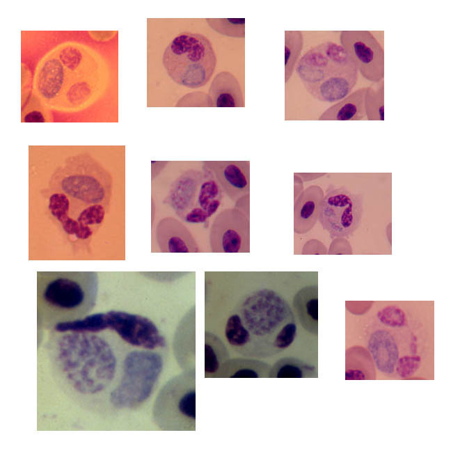 Plasmodium azurophilum is one of the more interesting species in the genus. The parasite infects Anolis lizards throughout the eastern Caribbean, including Puerto Rico and many Lesser Antilles islands (biogeography is covered by Staats and Schall, 1996, Biotropica). The species was described by S. R. Telford Jr. (Telford, 1975, International Journal for Parasitology) who noted that the parasite cells seldom store pigment and infect both erythorcytes and several classes of white blood cells. Thus, one of the diagnostic features of the genus Plasmodium, infecting of erythrocytes only, seems to be violated by this species. Later, S. Ayala (Ayala and Hertz, 1981, Revista do Instituto de Medicine Tropicale Sao Paulo) noted from lizards studied in Martinique that infections tended to be entirely infecting red or white blood cells and they wondered if there might be two species involved. Schall noted the same phenomenon on St. Martin (Schall, 1992, Oecologia). This suggested that the parasite might enter the host, first infecting red blood cells, then switching to the white cells. This was suggested because infected lizards tended to express more white blood cells in their blood than noninfected lizards. Thus, the parasite could be manipulating its host to produce its second class of host cell. S. Perkins then demonstrated that P. azurophilum indeed is two species with identical morphlogy under the light microscope (Perkins, 2001, Journal of Evolutionary Biology; Perkins, 2000, Proceedings of the Royal Society of London). Sequencing the cytochrome b gene, Perkins found that on each island there were different sequences for infections only in white vs. red cells. This was repeated on each island throughout the eastern Caribbean. Phylogenetic study showed that parasites in red cells are more closely related to those in red cells on other islands, even far away, than parasites in white cells on the same island. The ancestor of both species appears to have been a parasite in erythrocytes from either St. Kitts or nearby islands. Thus, the ancestor species (infecting red blood cells) produced a new species that infects only white cells -- a rare resource! We thus consider P. azurophilum to be two species, P. azurophilum (red) and P. azurophilum (white). These are cryptic, sister species. Perkins has not named a new species because it is possible that P. azurophilum (red) is already known under another name from Central America. A number of studies on the ecology (including virulence) of lizard malaria parasites in the Caribbean Anolis have not distingished between the two "P. azurophilum" species (Schall and Pearson, 2000, Journal of Herpetology; Schall and Vogt, 1993, Biotropica; Schall and Staats, 1997, Oecologia; Staats and Schall, 1996, Journal of Parasitology; Schall, 1992, Oecologia), whereas more recent studies divide data for the two species (Schall, Pearson, and Perkins, 2000, Journal of Parasitology; Schall, 2002, in The Behavioural Ecology of Parasities; Schall and Staats, 2002, Copeia). In the pictures below are shown P. azurophilum (white), both asexuals and gametocytes. Note the lack of malaria pigment. Often the parasite is not easy to detect, especially the male gametocytes, because they stain very pale in an already pale-staining cell. |