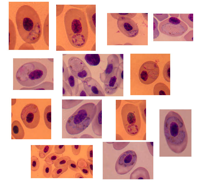 Plasmodium floridense is a parasite of Anolis lizards in the Caribbean islands, and as might be expected from its specific name, also in Florida and Georgia, USA. In the eastern Caribbean islands, it coexists with two species now combined under the name P. azurophilum (see the description of the biology of these species). P. floridense is a much smaller parasite than P. azurophilum and also produces malaria pigment that stains brown or golden brown (lacking in P. azurophilum). The shape of both asexual stages and gametocytes is quite variable, and for some time we wondered if one or more un-named species may also exist in the islands. However, sequencing some of the infections of odd-looking parasites revealed they were, in fact, P. floridense. Are the Caribbean parasites harmful to anoles? A preliminary study on St. Martin suggested they were, reducing hemoglobin in the lizard's blood (Schall, 1992, Oecologia). However, a detailed study on Saba (Netherlands Antilles) found little harm caused by any of the parasites for the Saban endemic anole (Schall and Staats, 2002, Copeia). Information on the ecology of P. floridense including its biogeography and systematics can be found in Vardo et al. (2005, Journal of Parasitology), Perkins and Schall (2002, Journal of Parasitology), Schall and Pearson (2000, Journal of Herpetology), Schall et al. (2000, Journal of Parasitology), Schall and Staats (1997, Oecologia), Staats and Schall (1996, Journal of Parasitology), Staats and Schall (1996, Biotropica), and Schall and Vogt (1993, Biotropica). |