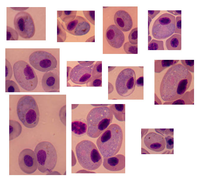Note that female gametocytes stain darker blue.