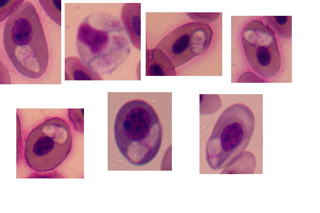 | Schellackia is a genus of Apicomplexan parasites, most likely within the hemogregarines or related to those parasites. The parasites in these pictures were all identified as Schellackia, but as can be seen, there are not many real characters to aid in identification. The species in California fence lizards undergoes asexual replication in the cells of the intestine, followed by sexual recombination, and eventually casts sporozoites into the blood cells. These cells are taken up in a blood meal of a mite where development of the parasite does not continue. The mite acts strictly as a passive vector. Lizards eat the mites and become infected when the parasite emerges from the blood cell in the lizard's stomach. Schellackia, or parasites very similar to Schellackia have been found in lizards all over the world during our collecting trips and are often far more common than any malaria parasites. These parasites may be confused at first with male gametocytes of Plasmodium. Above are pictures of the parasites found in a variety of lizards from our collecting trips. |