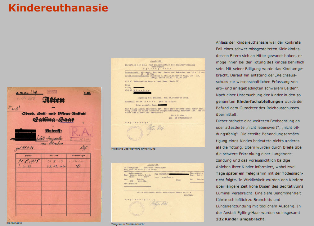A relative of one of the child victims, whose name was Hans Dieter Riess, published a web page about the fate of the child. The child had a disability (trisomy 21) and was murdered at Eglfing-Haar.
