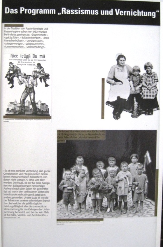 and annihilation'" Terms of Social Darwinist provenance such as "useless eaters" and "persons unworthy of living" are shown next to a display depicting people with disabilities as ape-like burden to society and a text from Binding/Hoche's book arguing for the termination of "life not worth living." Next to it is a picture of a Kalmenhof nurse and two children, intended as a contrast and meant to question such assertions and language. |