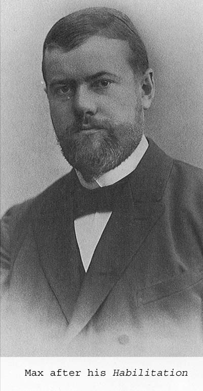 In the fall of 1887, just as Weber was beginning to write the initial essay for Levin Goldschmidt’s seminar that would be the foundation of his dissertation, Max wrote to Emmy that on the occasion of a family get-together, “it was as if my family had gone to Heidelberg only to bombard me from a short distance with heavy artillery, my father through Fritz [Baumgarten; one of Max’s cousins], my mother through letters and your father. When was I going to take the doctoral examination? My father, as I know well, is quietly disappointed that I have not managed to do that more quickly. I don’t want to be found wanting in this respect, do I?” Continuing on the issue in a later part of the same letter, he wrote, “it is a strange feeling to gradually outgrow one’s student shoes but still have to wait a long time before being one’s own master, at least for me, and yet I have to swallow this thought almost daily.”[28] The double burden of estrangement and financial dependence, which made his life increasingly gloomy and constrained, as Marianne commented,[29] continued. In 1891, Max wrote to Emmy’s father, “only with reluctance do I think of the transition from an expectant and unsalaried junior barrister and magistrate’s assistant to being an equally expectant and unsalaried university lecturer.”[30] He could look back to his period as junior barrister “only with horror,“ not having been able to shorten this “four-year pilgrimage by even one minute,” and abhorring the fact that it still might take long until he was “firmly established somewhere,“ he wrote to Emmy early the following year.[31] The father, meanwhile, still would not finance an independent household for Max, and kept complaining that the junior had taken too long to finish his Habilitation.[32] |