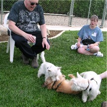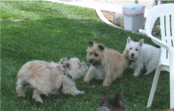 CA PARTYWell, we had a WONDERFUL TIME at the CA party. It was so great meeting those I had met in Biloxi and at Keller. And it was super meeting new people in Romoland I hadn't met before. Danielle and George were just FANTASTIC hosts. There was so much to see and do. I actually WON one of the dollar raffles.....this was a raffle that Mo was working, not the one that Karen Pee did. Did anyone tell you all about Karen Pee doing the auctions/raffles??? She was so great and sooooooooooo funny. Mo was kind enough to toss her winning ticket when she pulled it out, pulling another ticket. I actually was walking around earlier in the day selling raffle tickets(ME, the shy one!) for one of the quilt raffles....so didn't buy one myself, but I surely wanted to win. There were so many wonderful items available. And then there were so many other things to buy. I have a treasure trove of things to fly back home with me tomorrow. The hardest thing was watching Cruz go off with Lisa Neal....sure miss that boy. I got him for a bed buddy one night...sigh. I sure miss him. I miss my Nettie and the other kids, too. If you ever go to a cairn party, you will want to go to the next one, as we have so much fun. I got to watch Scruffy getting stripped. He was NOT a happy camper, and so went to sit behind everyone after he was allowed to get off the table. Poor guy, but he looks so good now. I got special pics of him biting that $45 rubber chicken in the butt....Marsha St. John won the chicken in the auction. I asked her why she would pay $45 for a rubber chicken that NOW doesn't squeak...she said "for the kids". Gotta love her. I got to meet so many of our CP kids, from Zoya to Baylee. There were some kids who will never make to the website as they were adopted (well, at least one that I can think of), and some who we all wish we could adopt. There were some kids that we've always wanted to meet and did. AND I got to meet Danielle and George's kids, including Tanzy the Mouth who is absolutely beautiful (and mouthy, lol). Sandy in CA (hahahah, soon back in TX)