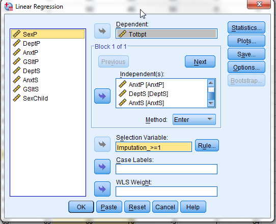 *Impute Missing Data Values. DATASET DECLARE SPSSImputations. MULTIPLE IMPUTATION SexP DeptP AnxtP AnxtS Totbpt DeptS GSItP GSItS SexChild /IMPUTE METHOD=AUTO NIMPUTATIONS=5 MAXPCTMISSING=NONE /MISSINGSUMMARIES NONE /IMPUTATIONSUMMARIES MODELS DESCRIPTIVES /OUTFILE IMPUTATIONS=SPSSImputations . DATASET ACTIVATE DataSet2. REGRESSION /SELECT=Imputation_ GE 1 /MISSING LISTWISE /STATISTICS COEFF OUTS CI(95) R ANOVA /CRITERIA=PIN(.05) POUT(.10) /NOORIGIN /DEPENDENT Totbpt /METHOD=ENTER SexP DeptP AnxtP DeptS AnxtS /SAVE SRESID.![]()