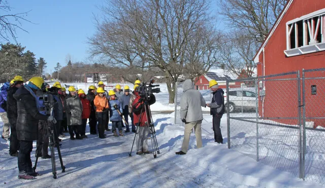 In a bold “do-it-yourself” gesture on a bright, sunny frigid February 4, a clutch of perhaps 50 warmly dressed fans of UVM farms donned hard hats and wielded a silver skinned sledge hammer aimed at a dilapidated barn on campus. Interim chair of the animal science department, David Kerr took the first swings, but it was current CREAM Program advisor Norm Purdie who did the first serious damage. By the time Vogelmann dealt the final blows, a hole tore all the way through to daylight in the open structure.