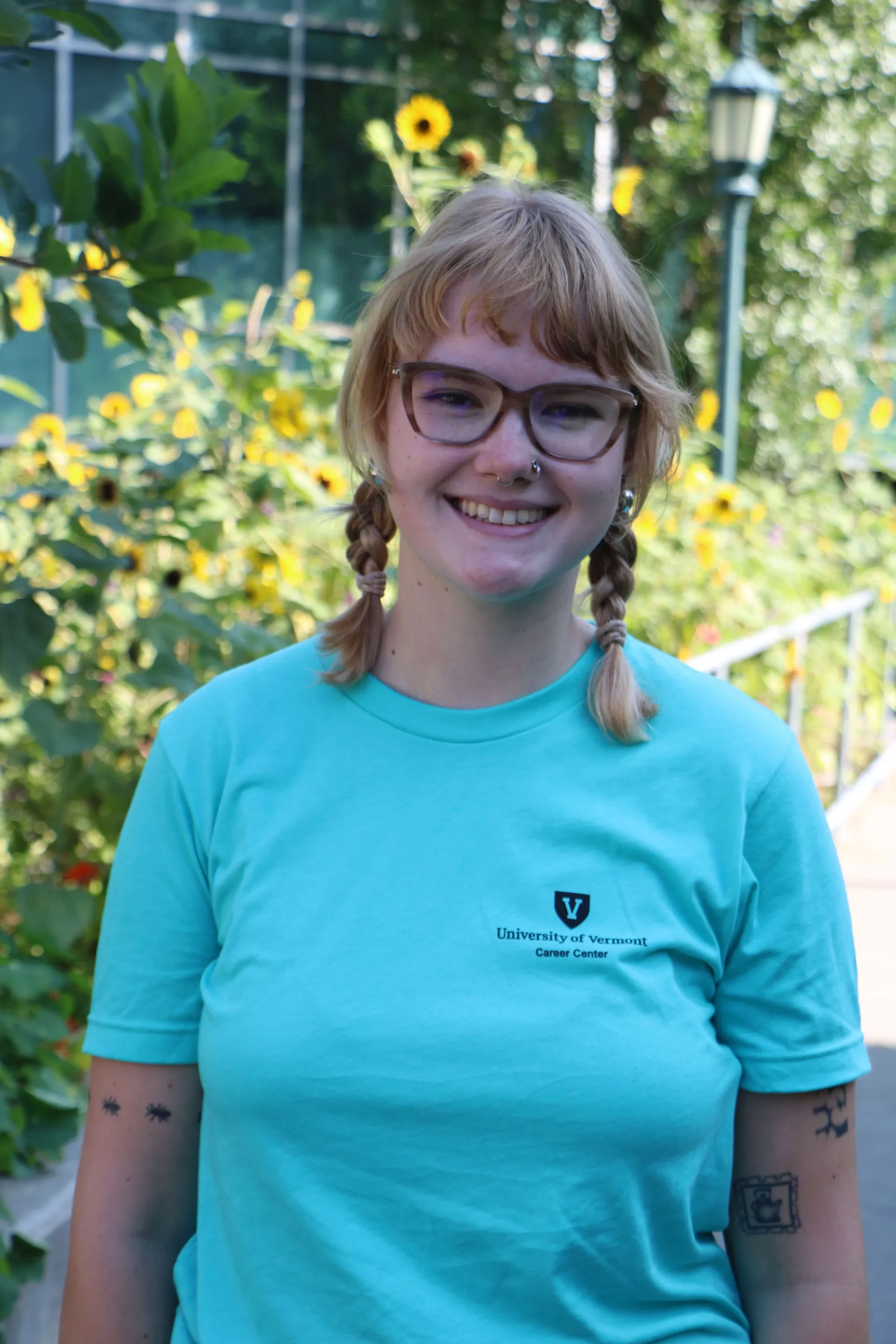 I'm Pauline, a Senior majoring in Environmental Studies with two minors, Art and Applied Design. I am interested in the intersection of environmental justice issues and how we communicate them through art and design. I am also the Program Director at UVM's radio station 90.1 WRUV, which has been a way for me to explore leadership and my passion for music. My hobbies are playing bass guitar, creating art, crochet/sewing, cooking and baking, and volunteering at the local animal shelter. In my role at the Career Center, I find it extremely fulfilling to be able to get to know my peers and assist them in making connections and strengthening their career-preparedness by figuring out the next steps on their journey.