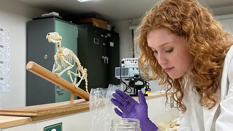 Walking home one day during her freshman year of high school, Lily Duerr ‘24 happened across a cat skull. At that moment, her interest in bones “took off like a rocket and never stopped,” she says. Her personal collection now numbers around 50 skulls and countless other bones, fossils, and rocks—and she has become adept at articulating skeletons, a skill she employs frequently as the first student to manage the vertebrate teaching collection at the UVM Natural History Museum.