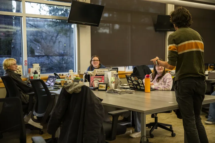 Editors talk in The Daily Iowan newsroom on Thursday, Feb. 29, 2024. (Emily Nyberg/The Daily Iowan)