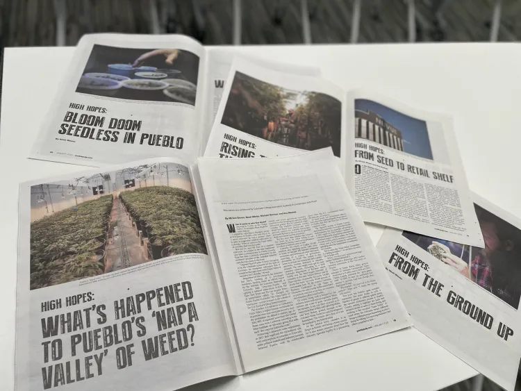 In the advanced journalism class, 12 to 15 students work in groups of four on a project for partner news organization. One recent advanced group partnered with Pulp, a news magazine in Pueblo, Colo., on a 10-part package about the cannabis industry’s failure to blossom as it was expected to.