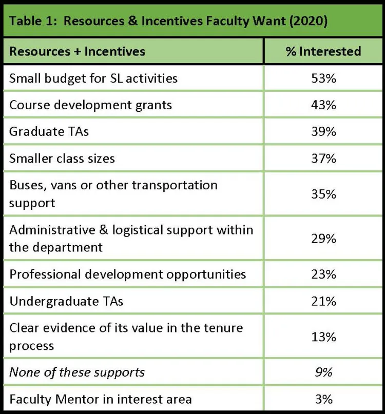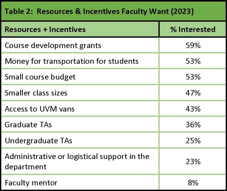 What stands out to us is that faculty do seem to have more additional supports offered now than in the time period covered in the 2020 survey. However, many of the same challenges with the additional work of community-engaged teaching were still apparent. When asked about resources they want, the vast majority of respondents wanted at least one additional resource, and the average number of additional resources desired was 3.6 (see second table below). However, what faculty want varies: for example, some faculty already have access to graduate TAs or course budgets within their units, while others do not. Transportation isn't required for courses that place students in downtown Burlington, but service learning outside of Chittenden County requires signifiant logistical support. Therefore, a particular resource desired by only 30% of faculty may still be very useful, as the most desired resource for that fraction of faculty. This tells us that we need to maintain flexibility in the allocation of resources to faculty.