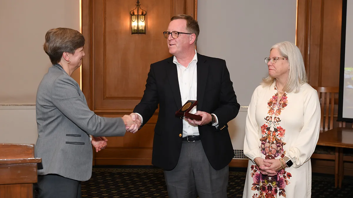 Acting Provost Linda Schadler presents Karl and Mary Fessenden with a duplicate medallion of the one awarded to Dr. Nic Fiorentino as the inaugural Karl and Mary Fessenden Professor in Biomedical Engineering.