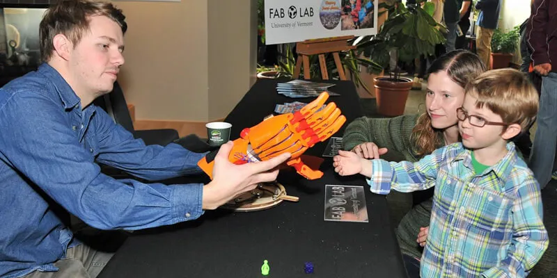 UVM had representatives from the Fab Lab and the student-run Alternative Energy Racing Organization. AERO designs and builds either a hybrid or all electric racecar to compete in Dartmouth’s annual Formula Hybrid Competition. The UVM Fab Lab showed 3D printed prosthetic hands made as part of the e-NABLE project.