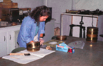 4. Clean sieves carefully between samples using stiff wire brush. Sweep sample table between each sieving. Only a few sample grains should remain lodged in each sieve.