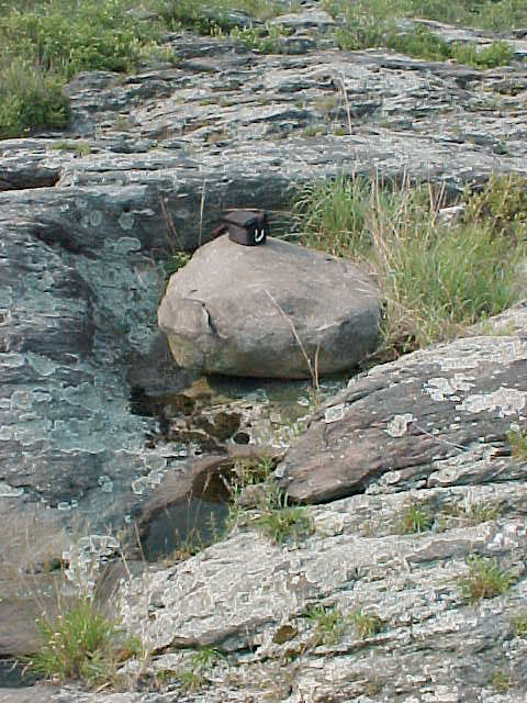 Quartz pebble conglomerate boulder on crow island III. Glacial polish preserved on the underside of the boulder. Note camera case for scale. Boulder is sitting in a semi-circular depression on a level 2 surface.