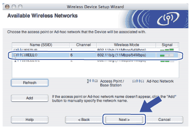 | 12 | The wizard will search for wireless networks available from your printer. Choose the Ad-hoc network you wish to associate the printer with, and then click Next. ![]() |