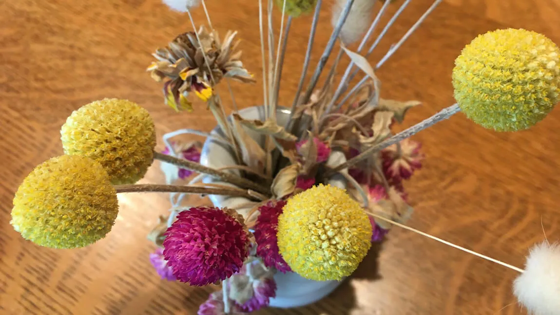 Great dried annual flowers include plants such as sunballs (Craspedia globosa), globe amaranth (Gomphrena globosa), bunny tails (Lagurus ovatus), statice (Limonium sinuatum) and strawflower (Bracteantha bracteata).