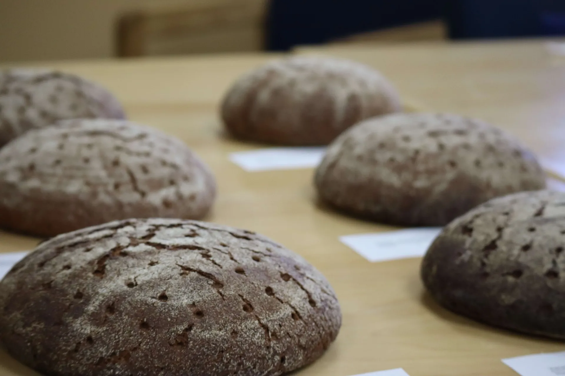 On our most recent sensory panel, the team evaluated bread made from two different varieties of rye that were a part of a rye harvest date trial conducted in 2024. Within this trial, rye varieties ‘Danko’ and ‘Hazlet’ were harvested at weekly intervals over four weeks, with various field and harvest metrics collected over this period. Additionally, standard lab analyses for cereal quality were conducted in the E.E. Cummings Crop Testing Laboratory including grain starch, crude protein, and falling number. Each of these analyses are typical indicators of grain quality for both growers and bakers.