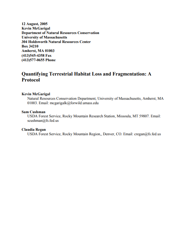 Riitters K. H. "Forest Fragmentation", 2007 pp 9-15 In: Forest health monitoring: 2005 national technical report. General Technical Report SRS-104. Asheville, NC: U.S. Department of Agriculture, Forest Service, Southern Research Station.