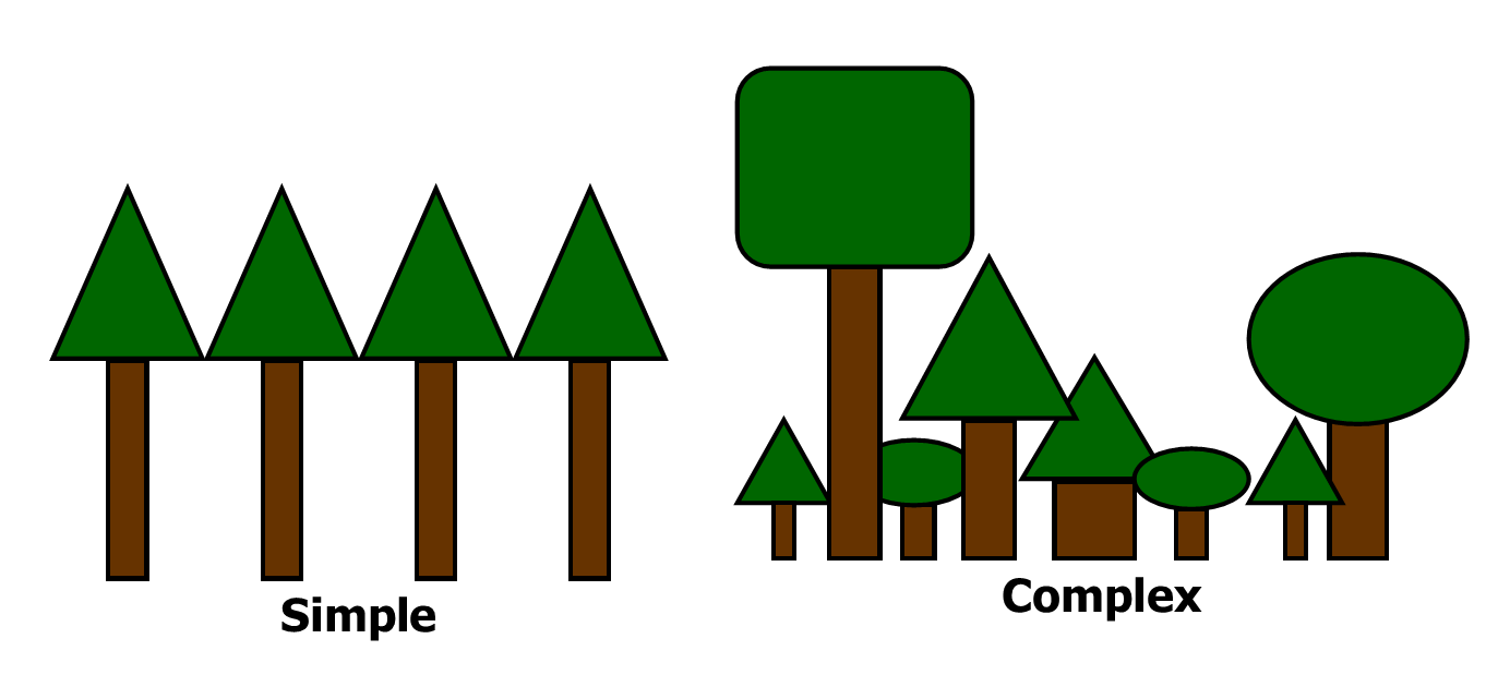 Forest structure can be simple, complex, or somewhere in between . A forest with a simple structure will appear park-like. Trees may be evenly spaced apart and of a similar size and species. Conversely, a forest with a more complex structure will have trees of various sizes and species and unevenly spaced. On a landscape scale, a more desirable structure are forests that span a range of types and successional stages.