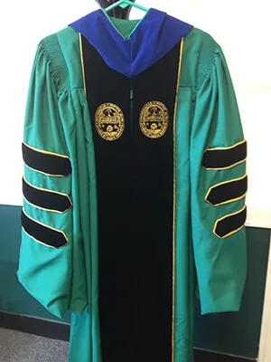 You may be asking yourself: What is “doctoral regalia"? If you have ever been to a University or College Commencement, you very likely noticed the colorful robes worn by the faculty and members of the platform party. And if you wondered why the robes were mostly different from each other, it’s because each robe, or regalia, signifies the institution from which that person graduated with their doctoral degree. Stanford University, for instance, has a lovely cardinal red–colored regalia. Michigan’s is blue and gold, and North Carolina, as you might imagine, is light blue.