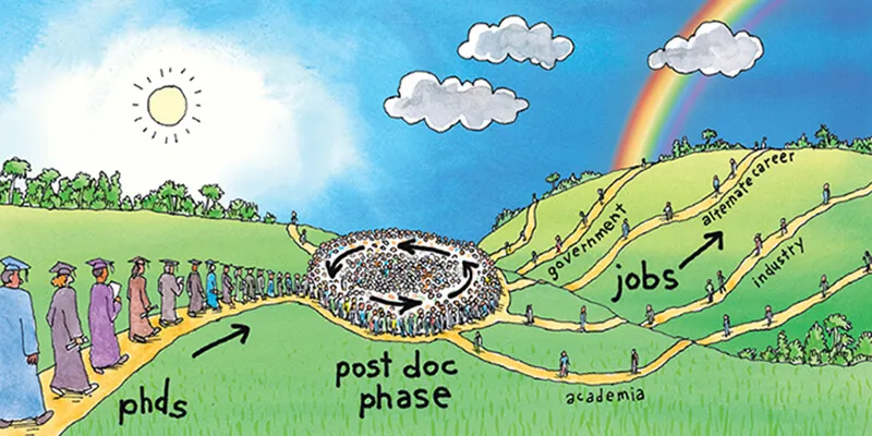 The postdoc phase, as depicted in the illustration by Tom Dunne, is analogous in many ways. Unlike graduate school, the postdoc phase is not linear; it has no pre-defined endpoint, such as a successful dissertation defense. This allows postdocs to gain real-life experiences and acquire the professional skills necessary for success in academia, industry, government, policy, and a variety of “alternate” careers. During this transition period, postdocs often take many “laps,” with exposure to multiple successful career opportunities. However, postdoctoral trainees can get stuck circling on an inside loop (“permadoc”).