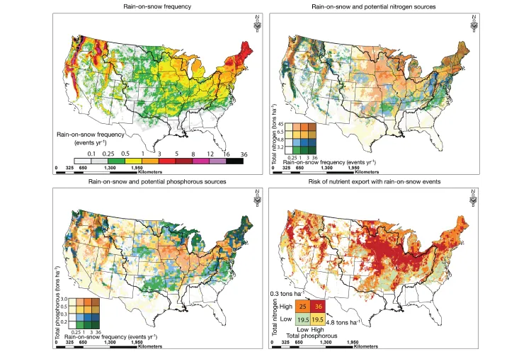 Of particular concern are so-called “rain-on-snow” events, researchers say, which can cause large, economically and environmentally devastating floods. The team used geospatial datasets to explore the impacts of rain-on-snow in U.S. regions with large pools of nitrogen and phosphorous.