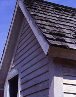 The roof is covered with wood shingles. The wooden structure is placed