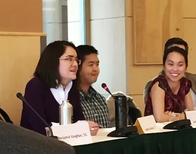 Tran noted that her work on an Honors thesis project enabled her to stand out in medical school applications, and her experience in UVM’s Premedical Enhancement Program (PEP) prepared her for the rigors of day-to-day life as a medical student. Johnson reflected that her work in both English and economics enabled her to firmly grasp the power of narratives and numerical data, as well as how the two work together in a fast-paced business environment. Frankel advised students to seek out mentors in the Honors College, seek out help when they feel they get in over their head, and stick with the rigors of the program; as she saw it, it was a challenging but well worthwhile experience that enabled her to develop relationships with fellow students and faculty that she now counts among her friends. And Vaughan advised students to find time for themselves, to have fun, to explore their own ideas, because it could turn into something they want to focus on during their college career as well as after it.