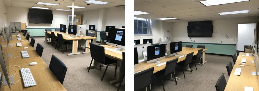The Waterman 113Q lab consists of Mac computers capable of running macOS or virtualized Microsoft Windows, projected instructor stations, and other additional equipment.