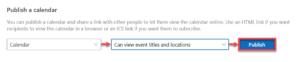 - Select the calendar you would like to publish and your preferred permissions level, and then click Publish