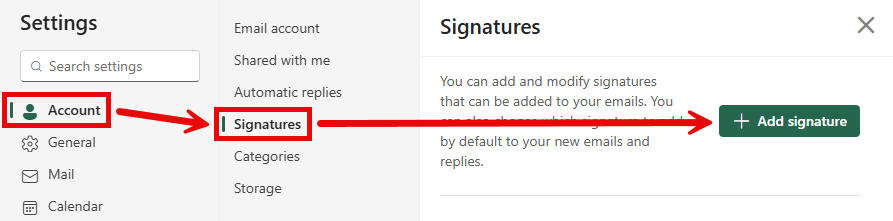 - Within the Account tab on the left side, select Signatures and then click + Add signature.