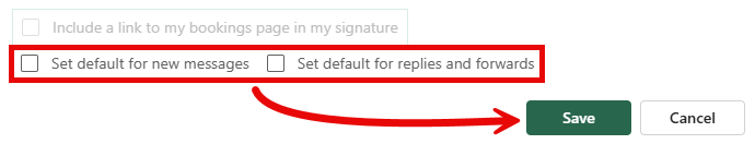 - You can select it as a default signature for new messages, replies/forwards, or both using the respective checkboxes if you’d like. Then click Save.