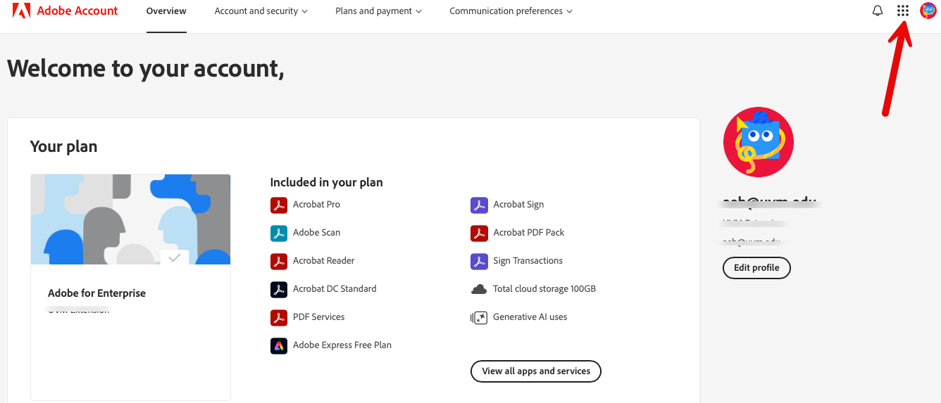 5. You will end up on the Adobe Creative Cloud application selection page with options to install those that you have a license for.  Click the waffle icon in the upper right corner.