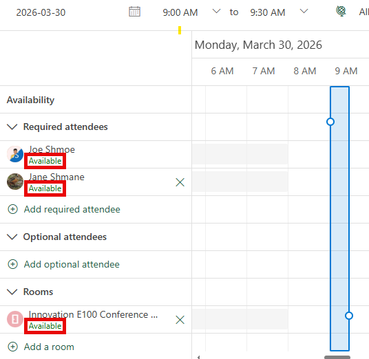 - Along the left side of the window, you can see whether the attendees and the room are all Available at the selected time.