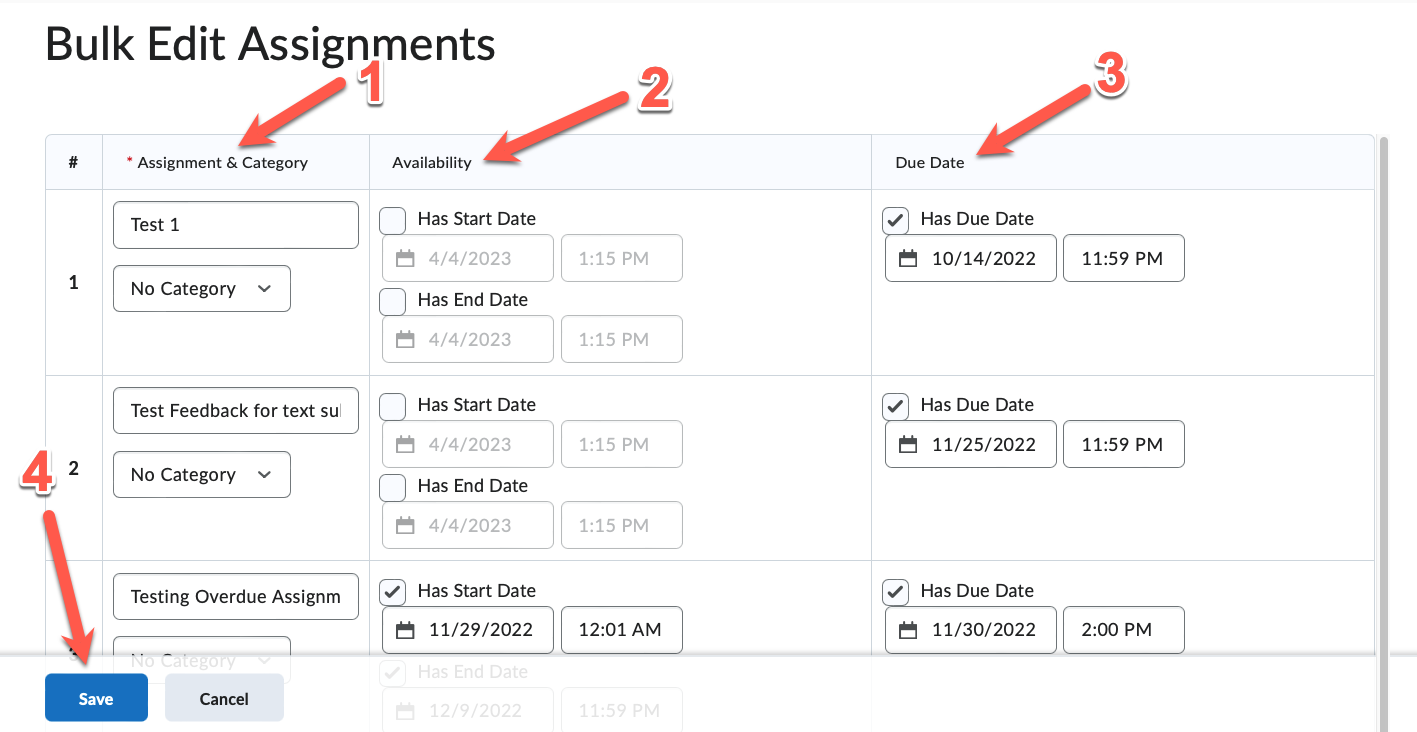 Bulk Edit within the Assignments Tool allows you to edit one or more items Titles & Categories, Availability and due dates all at once. The Reorder feature allows you to reorganize your assignments in one place as well. To begin navigate to your Assignments tool area.