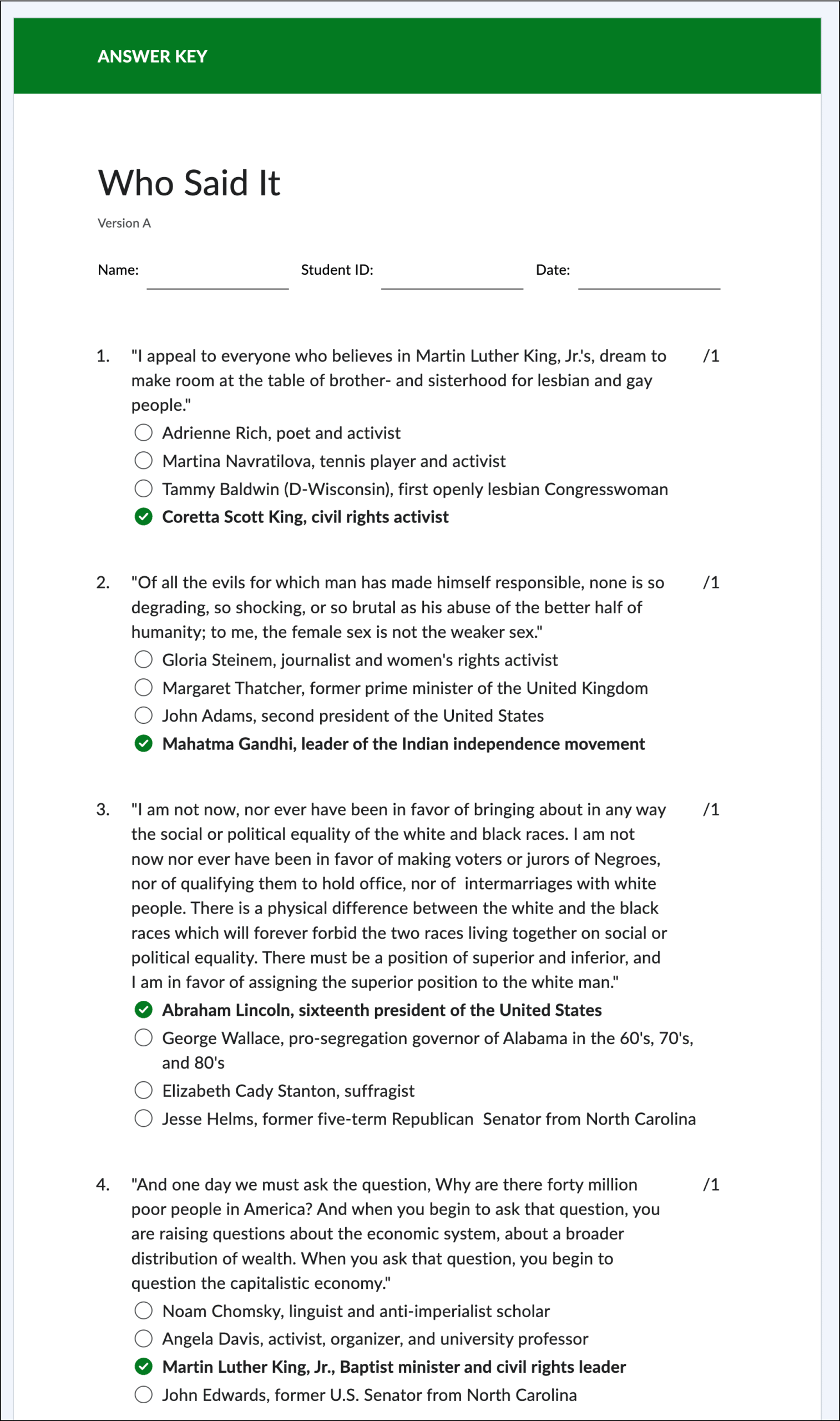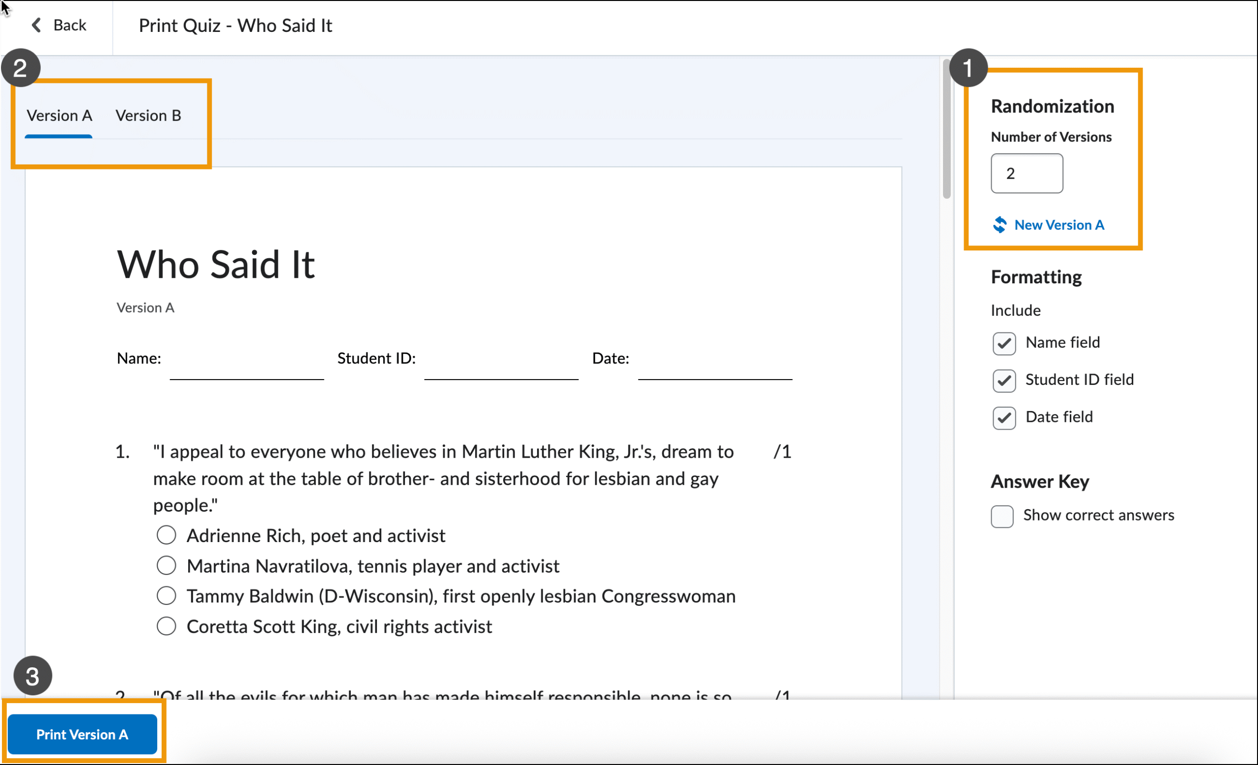 Click to enlarge ↑ - To print a different version of the quiz (Version B), select the version and click Print.