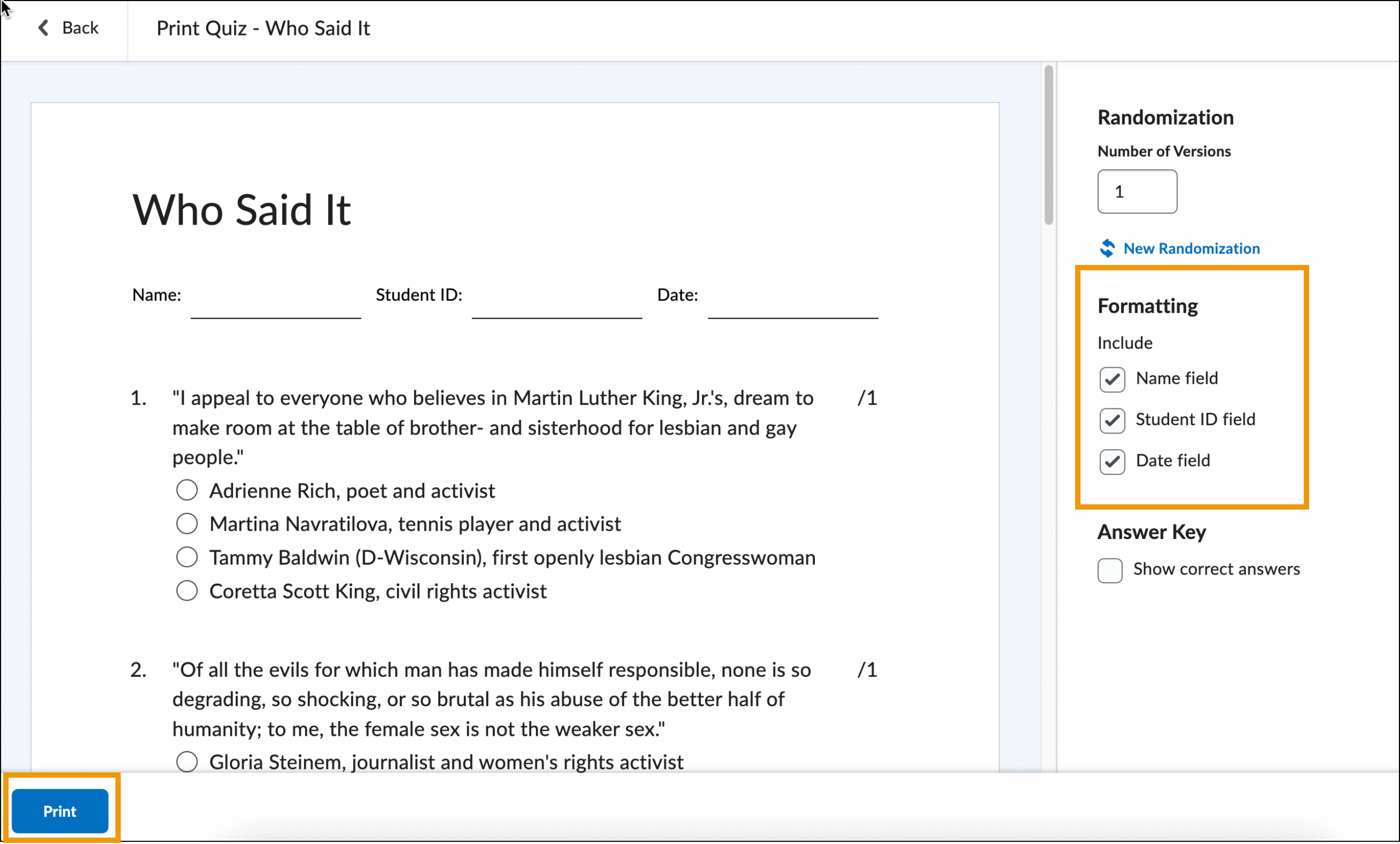 Click to enlarge ↑ - Formatting Preferences: Add field names like Name, Student ID, and Date to the printed quiz. Click Print.