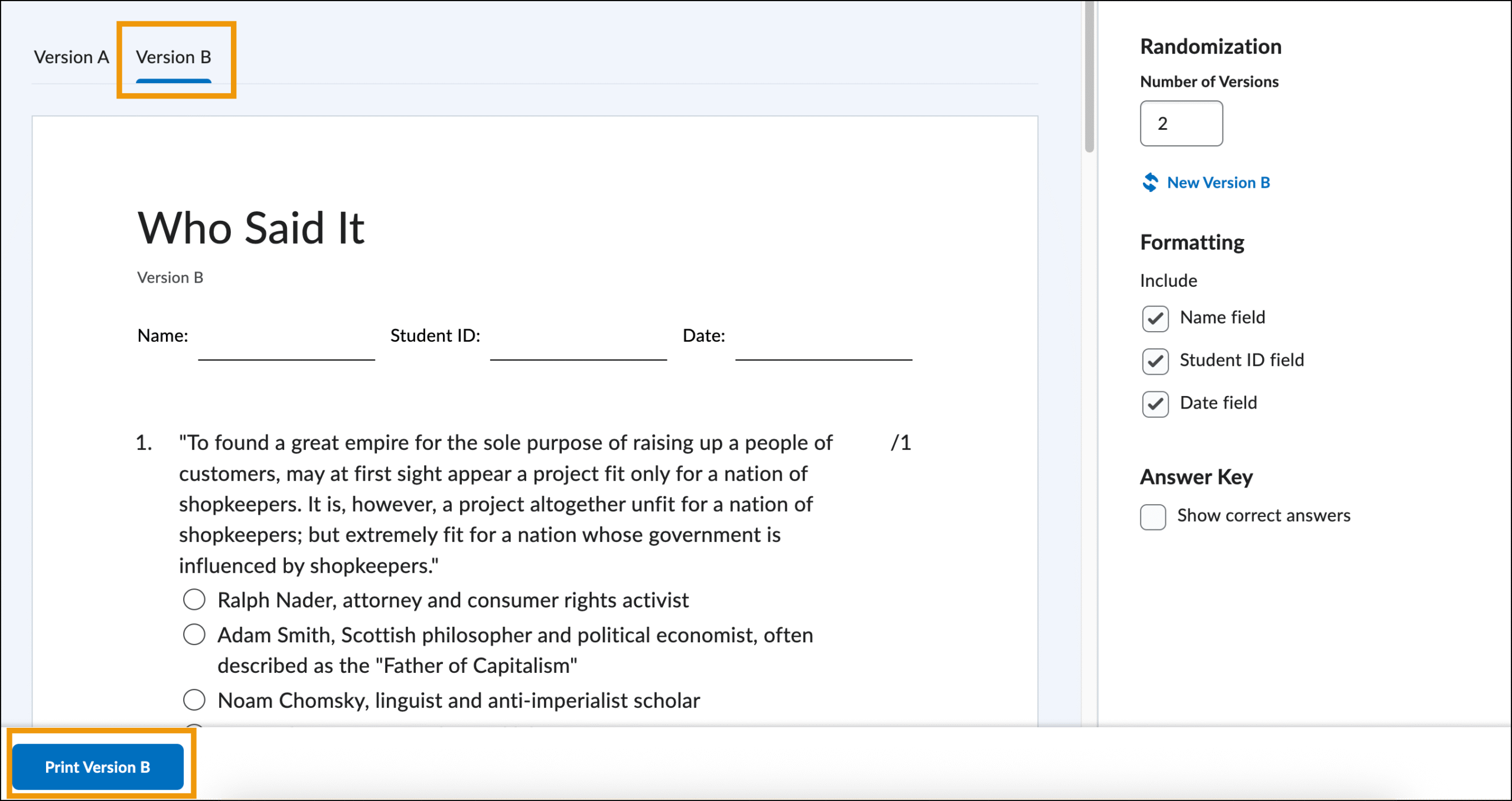 - In the Randomization field, enter a number between 1 and 10, depending on how many versions of the quiz you want to generate. This example shows a quiz with two versions, Version A and Version B. Select the version of the quiz you want to print, then click Print.